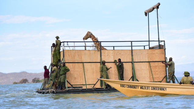 A mother and calf are the last of nine endangered giraffes to be transported to Kenya’s mainland as rising waters threaten their home island in Lake Baringo.