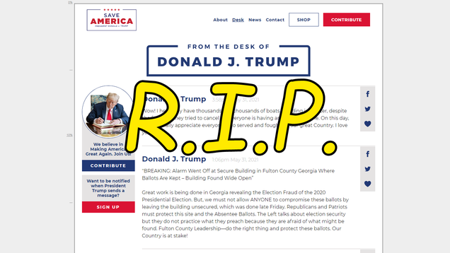 The media layoffs continue unabated. The former president’s blog, From the Desk of Donald J. Trump, has ceased all editorial operations, deleted its website and all existing posts, and let go of what was presumably its only staffer (Trump).