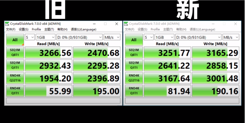 This CrystalDiskMark test makes the newer, inferior drive look faster than the original in most tests—but notice the very small 1GiB test size. This test isn’t escaping the SLC write cache! [credit: