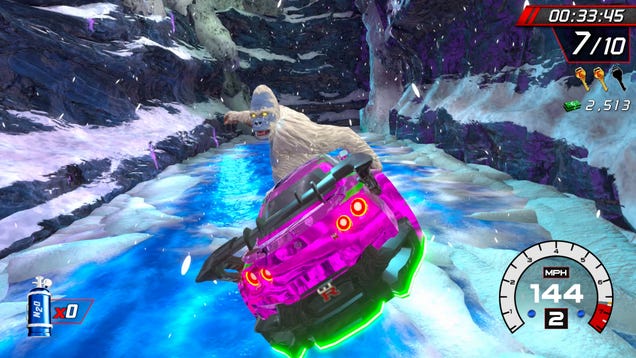 Microsoft and Sony can have their Forzas and Gran Turismos with hyper-realistic graphics, authentic engine noises, and true-to-life physics. The Nintendo Switch has Cruis’n Blast, in which your vaguely Nissan GT-R-shaped vehicle barrels off a cliff at breakneck speed toward a massive yeti which then cracks open a…