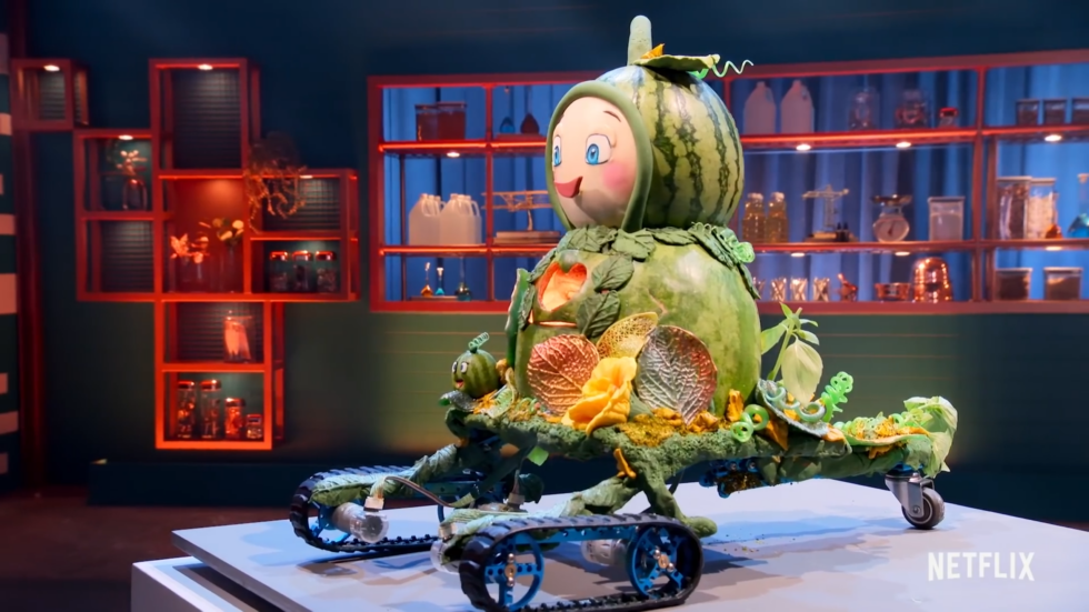 The vehicles built by contestants on Baking Impossible consist of roughly 80-90 percent edible parts, like this impressive robot made largely out of watermelon. [credit: