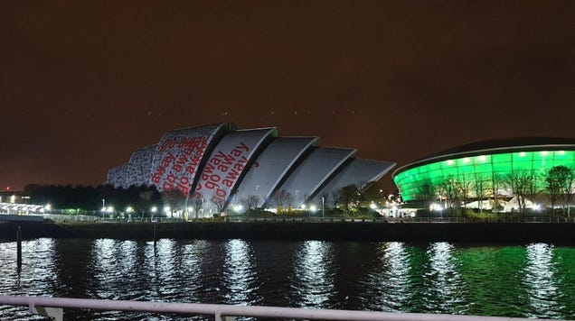 GLASGOW, SCOTLAND — Tuesday night saw a war of the projections in Glasgow. Activists sent a message to the United Nations, and the UN struck back, though the organization may have accidentally told onlookers in Glasgow to “go away.”