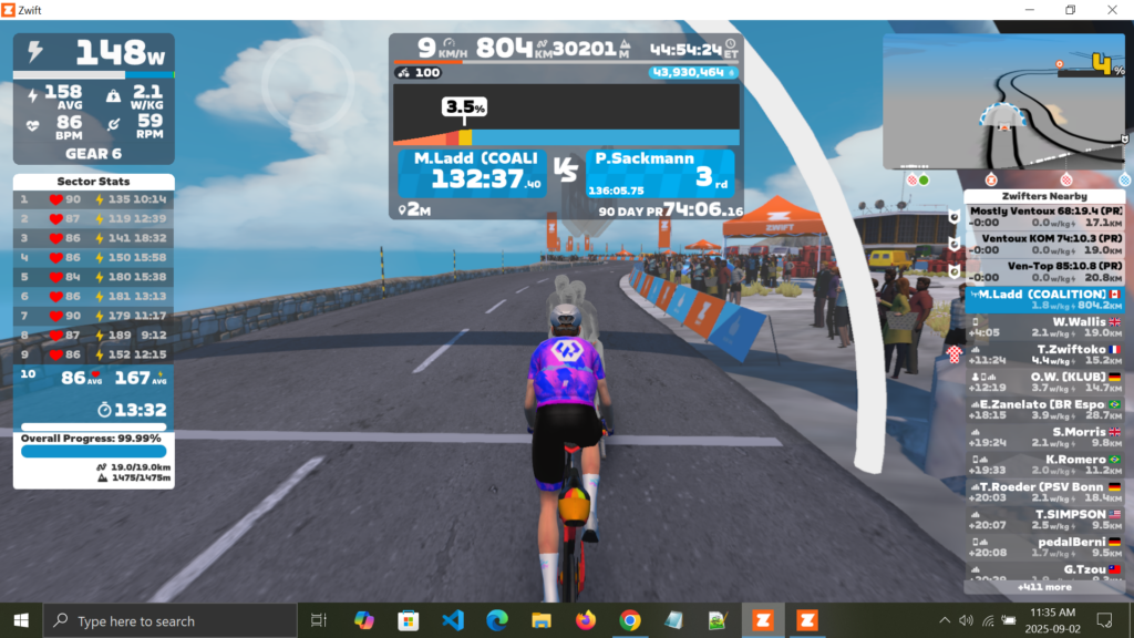 In late June, Matt launched what may have been the most ambitious block of his year: a multi‑day effort centered around Ventop, Zwift’s virtual take on Mont Ventoux. Between June 26 and June 29, with breaks only for sleep and recovery, he climbed Ventop 18 times, riding 728 kilometers and accumulating 27,112 meters of elevation.