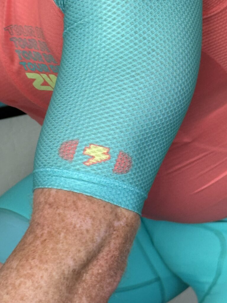 If you look closely, you’ll see some nice finishing touches on these bibs: a little pocket on the back brace to hold a gel or even your phone, a logo on the chamois, plus the feel-good factor of 75% recycled lycra composition… these aren’t just basic bibs. They also feature an extra-wide leg gripper, which is actually the only difference I can see between these and the Watopia Essentials bibs, which feature a Pedal Mafia-branded leg gripper via the more “generic” diamond gripper of the TdZ bibs (see below).